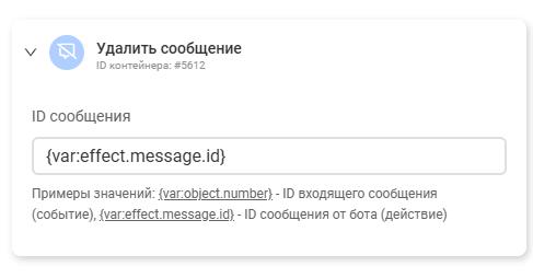 По умолчанию стоит переменная {var:effect.message.id} - id последнего сообщения от бота.