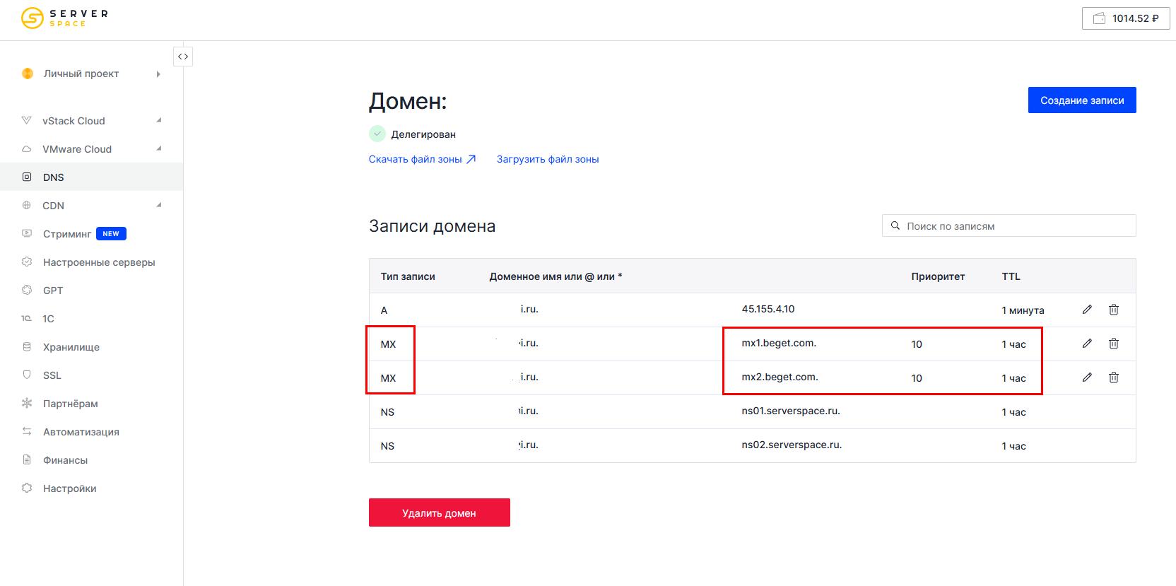 После регистрации в Serverspace заходим в раздел DNS и нажимаем "Добавить домен".